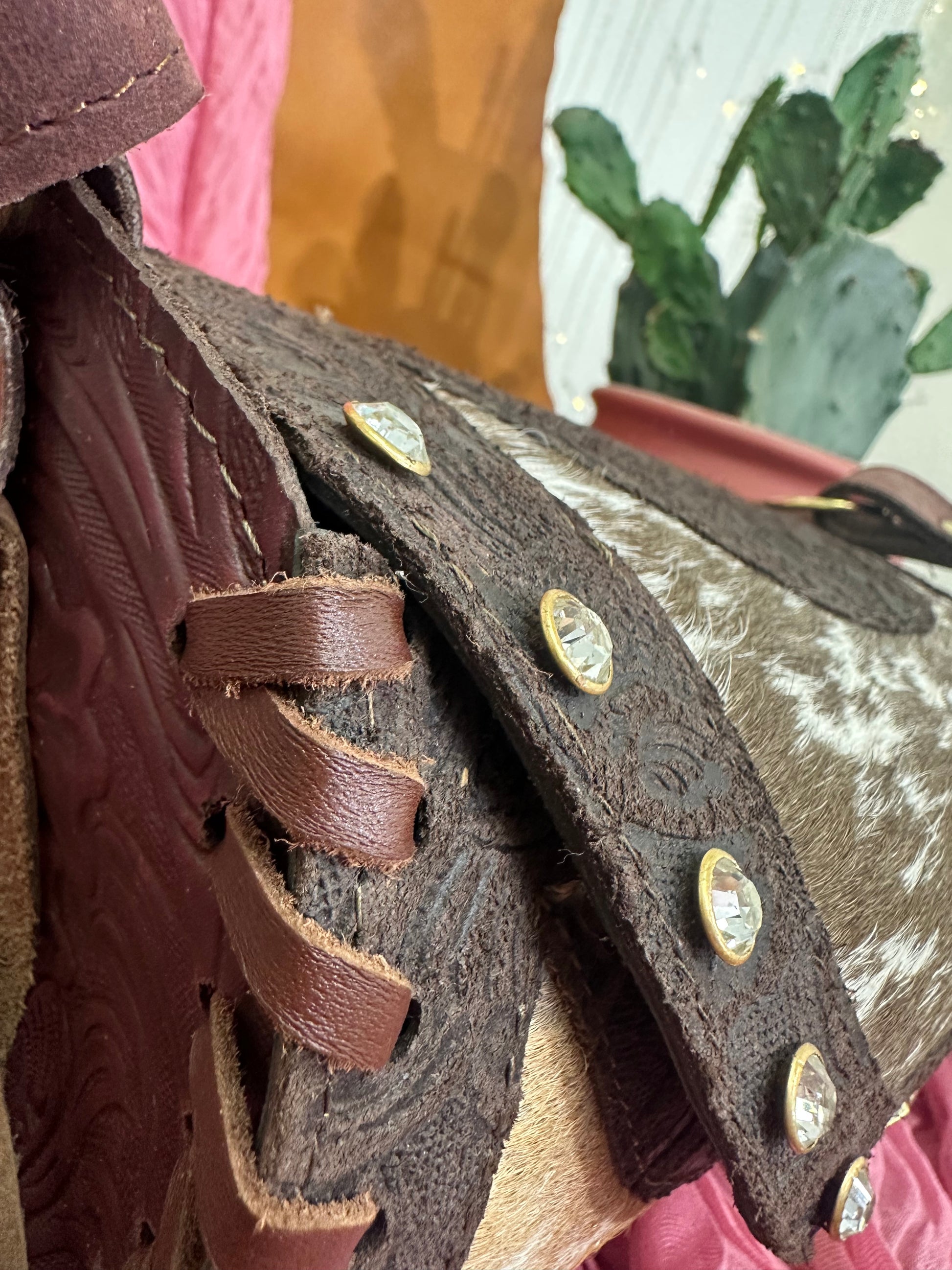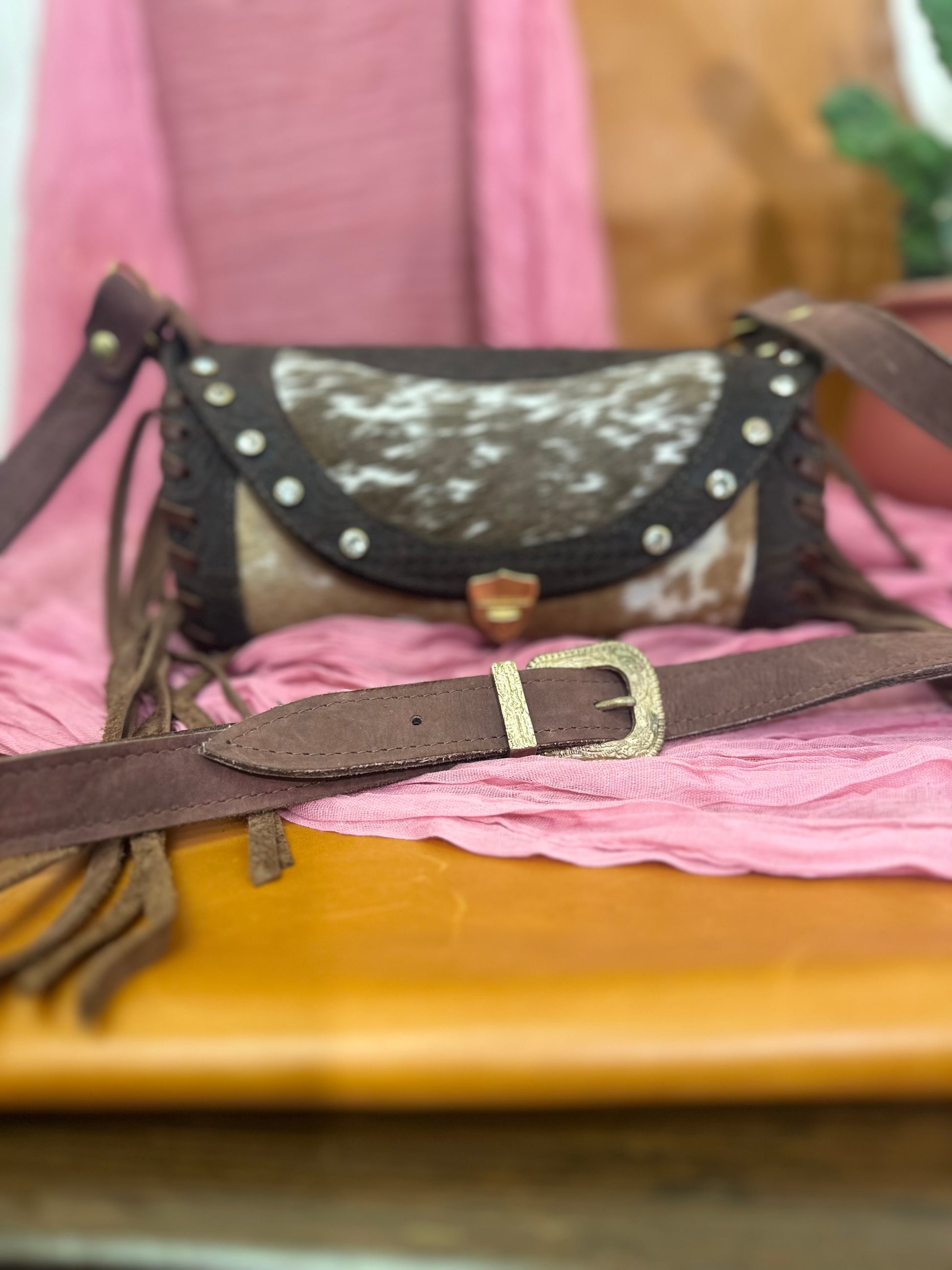 Ramona is a one-of-a-kind leather bucket bag, made with stamped vaqueta leather and cowhide is adorned with gold hardware, tassels, and shiny studs. The unique cylinder shape, intricate stitching, and leather strap make it a standout piece. Add a touch of luxury to your wardrobe with this statement bag. It measures 10x 7 x 5