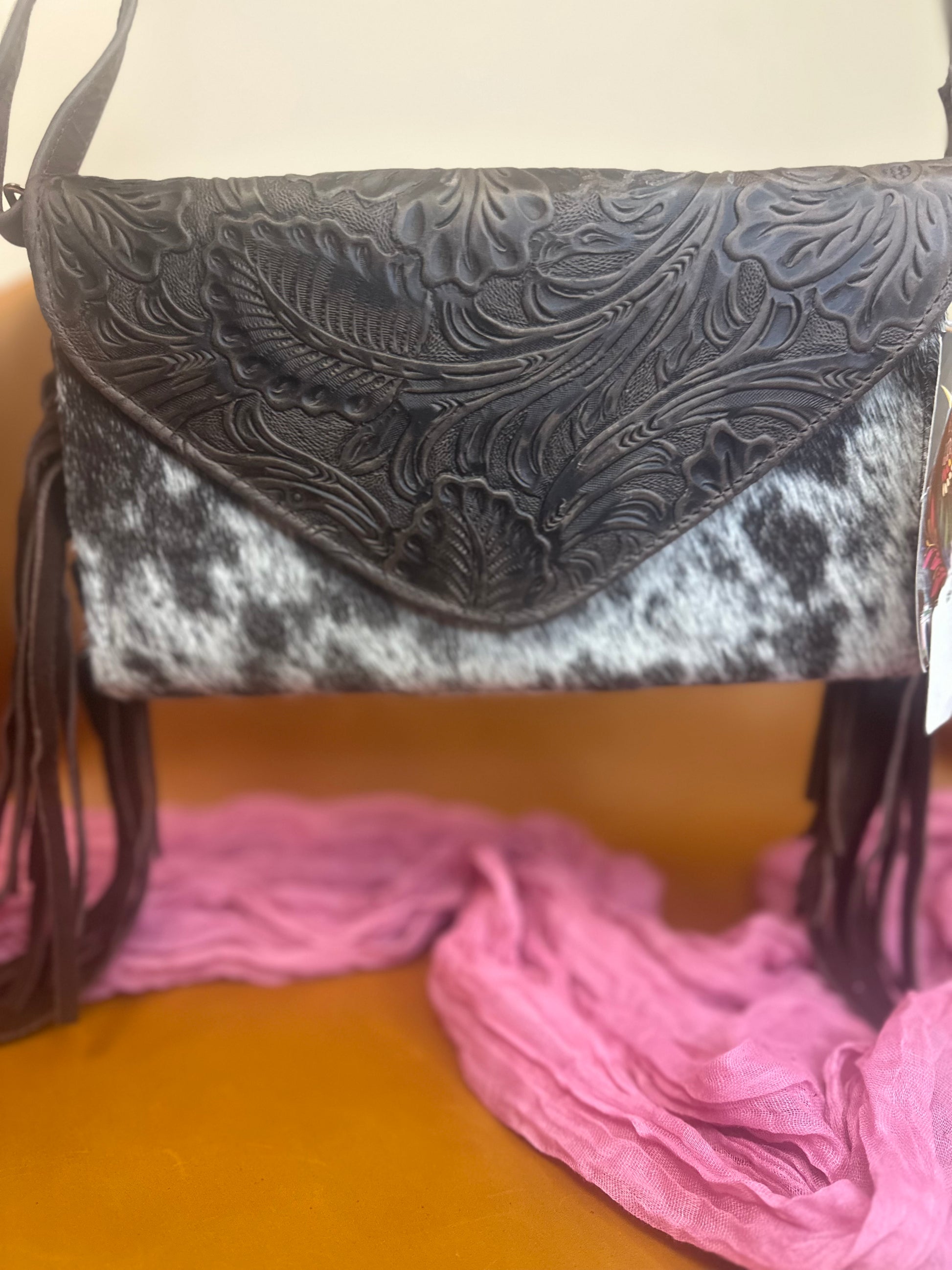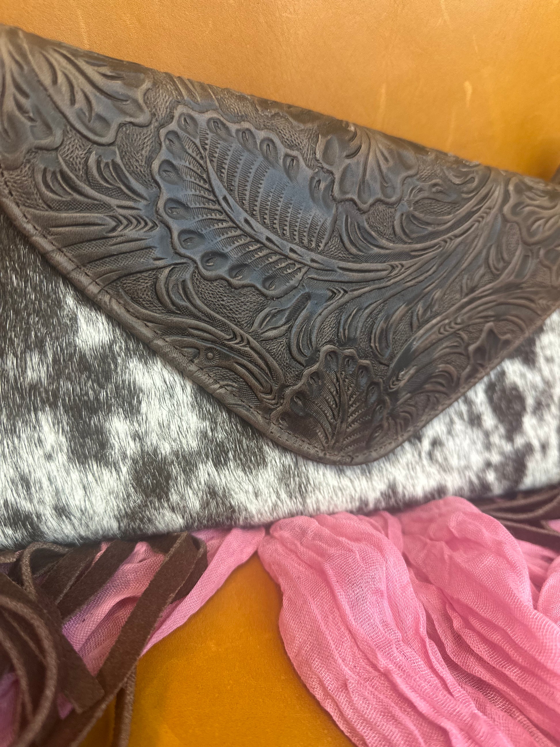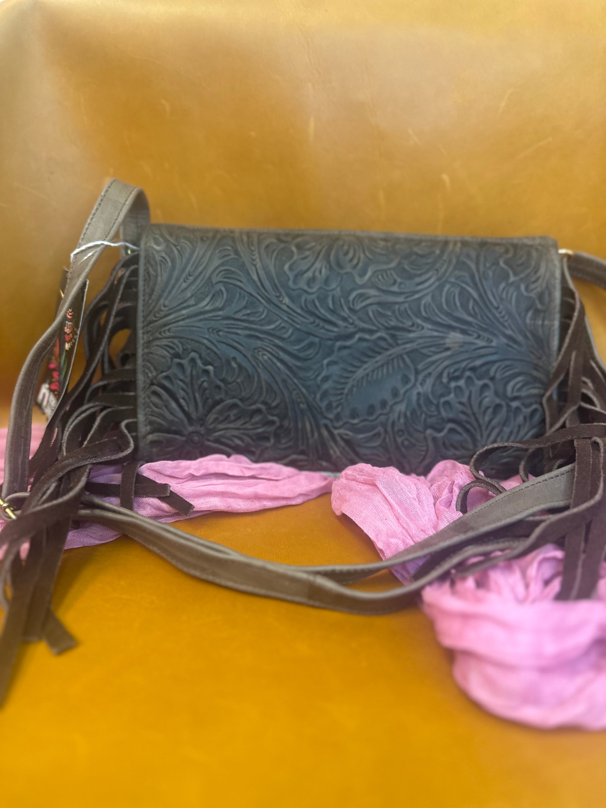 Zara is a cute, small wallet bag! It has beautiful tassels featuring stamped leather all around. We have three pieces in stock a purple stained leather piece, an orange and brown piece. It has three compartments and a built in card holder. It comes with its detachable strap. It measures 10x1x6 inches.